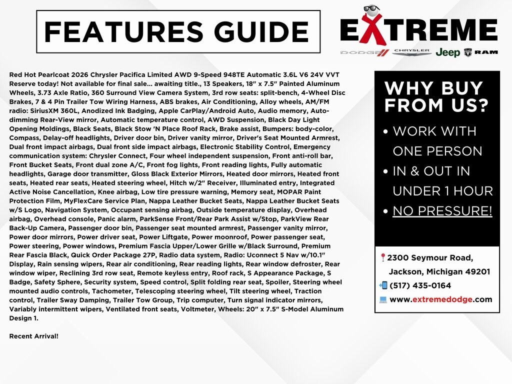 Red Hot Pearlcoat 2026 Chrysler Pacifica Limited AWD 9-Speed 948TE Automatic 3.6L V6 24V VVT Reserve today! Not available for final sale... awaiting title., 13 Speakers, 18" x 7.5" Painted Aluminum Wheels, 3.73 Axle Ratio, 360 Surround View Camera System, 3rd row seats: split-bench, 4-Wheel Disc Brakes, 7 & 4 Pin Trailer Tow Wiring Harness, ABS brakes, Air Conditioning, Alloy wheels, AM/FM radio: SiriusXM 360L, Anodized Ink Badging, Apple CarPlay/Android Auto, Audio memory, Auto-dimming Rear-View mirror, Automatic temperature control, AWD Suspension, Black Day Light Opening Moldings, Black Seats, Black Stow 'N Place Roof Rack, Brake assist, Bumpers: body-color, Compass, Delay-off headlights, Driver door bin, Driver vanity mirror, Driver's Seat Mounted Armrest, Dual front impact airbags, Dual front side impact airbags, Electronic Stability Control, Emergency communication system: Chrysler Connect, Four wheel independent suspension, Front anti-roll bar, Front Bucket Seats, Front dual zone A/C, Front fog lights, Front reading lights, Fully automatic headlights, Garage door transmitter, Gloss Black Exterior Mirrors, Heated door mirrors, Heated front seats, Heated rear seats, Heated steering wheel, Hitch w/2" Receiver, Illuminated entry, Integrated Active Noise Cancellation, Knee airbag, Low tire pressure warning, Memory seat, MOPAR Paint Protection Film, MyFlexCare Service Plan, Nappa Leather Bucket Seats, Nappa Leather Bucket Seats w/S Logo, Navigation System, Occupant sensing airbag, Outside temperature display, Overhead airbag, Overhead console, Panic alarm, ParkSense Front/Rear Park Assist w/Stop, ParkView Rear Back-Up Camera, Passenger door bin, Passenger seat mounted armrest, Passenger vanity mirror, Power door mirrors, Power driver seat, Power Liftgate, Power moonroof, Power passenger seat, Power steering, Power windows, Premium Fascia Upper/Lower Grille w/Black Surround, Premium Rear Fascia Black, Quick Order Package 27P, Radio data system, Radio: Uconnect 5 Nav w/10.1" Display, Rain sensing wipers, Rear air conditioning, Rear reading lights, Rear window defroster, Rear window wiper, Reclining 3rd row seat, Remote keyless entry, Roof rack, S Appearance Package, S Badge, Safety Sphere, Security system, Speed control, Split folding rear seat, Spoiler, Steering wheel mounted audio controls, Tachometer, Telescoping steering wheel, Tilt steering wheel, Traction control, Trailer Sway Damping, Trailer Tow Group, Trip computer, Turn signal indicator mirrors, Variably intermittent wipers, Ventilated front seats, Voltmeter, Wheels: 20" x 7.5" S-Model Aluminum Design 1.