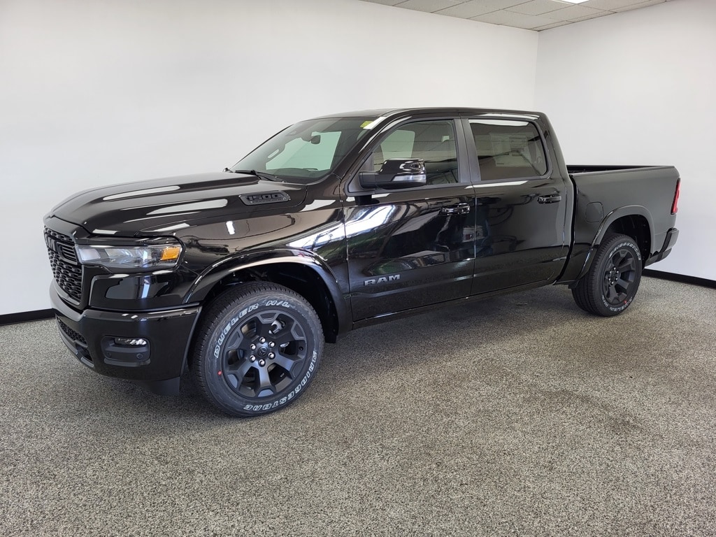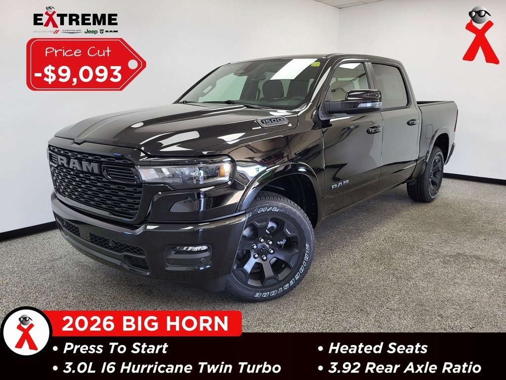Diamond Black Crystal Pearlcoat 2026 Ram 1500 Big Horn/Lone Star 4WD 8-Speed Automatic 3.0L I6 115V Auxiliary Power Outlet, 115V Auxiliary Rear Power Outlet, 12" Touchscreen Display, 2nd Row In Floor Storage Bins, 3 Rear Seat Head Restraints, 4 Way Front Headrests, 4-Wheel Disc Brakes, 400W Inverter, 48V Belt Starter Generator, 4G LTE Wi-Fi Hot Spot, 6 Speakers, 9 Amplified Speakers w/Subwoofer, ABS brakes, Accent Color Door Handles, Accent Color Premium Power Mirrors, Accent Color Tailgate Handle, Air Conditioning, Air Conditioning ATC w/Dual Zone Control, Alloy wheels, AM/FM radio, Anti-Spin Differential Rear Axle, Apple CarPlay, Apple CarPlay/Android Auto, Auto High-beam Headlights, Auto Power-Folding Mirrors, Auto-Dimming Exterior Driver Mirror, Auto-Dimming Rear-View Mirror, Big Horn Level 2 Equipment Group, Black Exterior Mirrors, Black Exterior Truck Badging, Black Headlamp Bezels, Black Interior Accents, Black Painted Exterior Mirrors Caps, Black Premium Power Mirrors, Black Tail Lamp Bezels, Body Color Fender Flares, Body Color Front Bumper, Body Color Rear Bumper w/Step Pads, Brake assist, Bucket Seats, Bumpers: chrome, Center Console Parts Module, Cloth Bucket Seats, Cluster 7.0" TFT Color Display, Compass, Configurable Drive Mode, Connected Travel & Traffic Services, Connectivity - US/Canada, Convex Wide-Angle Exterior Mirror Insert, Delay-off headlights, Deluxe Cloth Bucket Seats, Disassociated Touchscreen Display, Driver door bin, Dual Exhaust w/Black Tips, Dual front impact airbags, Dual front side impact airbags, Electronic Stability Control, Exterior Mirrors Courtesy Lamps, Exterior Mirrors w/Heating Element, Exterior Mirrors w/Supplemental Signals, Front anti-roll bar, Front Bucket Seats, Front Center Armrest w/Storage, Front fog lights, Front reading lights, Front Seat Back Map Pockets, Front wheel independent suspension, Full Length Floor Console, Fully automatic headlights, Global Telematics Box Module (TBM), Glove Box Lamp, Google Android Auto, GPS Antenna Input, GPS Navigation, Grille Black Surround Black Mesh, HD Radio, Heated door mirrors, Heated Front Seats, Heated Steering Wheel, Illuminated entry, Integrated Center Stack Radio, Integrated Voice Command w/Bluetooth, Leather Wrapped Steering Wheel, LED Dome Lamp w/On/Off Switch, LED Footwell Lighting, Low tire pressure warning, Manual Adjust 4-Way Driver Seat, Manual Adjust 4-Way Front Passenger Seat, Manual Folding Exterior Mirrors, Manufacturer's Statement of Origin, Media Hub w/2 Charge Only USBs, MOPAR Front & Rear Rubber Floor Mats, Night Edition, Occupant sensing airbag, Outside temperature display, Overhead airbag, Overhead console, Overhead LED Lamps, ParkView Rear Back-Up Camera, Passenger door bin, Passenger vanity mirror, Power 2-Way Driver Lumbar Adjust, Power Adjust 8-Way Driver Seat, Power Adjustable Pedals, Power door mirrors, Power steering, Power windows, Premium Overhead Console, Quick Order Package 21Z Big Horn, Radio data system, Radio: Uconnect 5 Nav w/12.0" Display, Radio: Uconnect 5 W w/8.4" Display, RAM Grille Badge - Black, RAM Grille Badge - Chrome, Rear 60/40 Folding Seat, Rear anti-roll bar, Rear Center Armrest, Rear Power Sliding Window, Rear step bumper, Rear Wheelhouse Liners, Rear Window Defroster, Remote keyless entry, Remote Tailgate Release, Secondary Active Grille Shutters, Security Alarm, SiriusXM Radio Service, SiriusXM w/360L, Speed control, Steering Wheel Mounted Audio Controls, Sun Visors w/Illuminated Vanity Mirrors, Supplier Part Tracking (J-1), Tachometer, Telescoping steering wheel, Tilt steering wheel, Traction control, Trailer Brake Control, Trip computer, Universal Garage Door Opener, USB Host Flip, Variably intermittent wipers, Voltmeter, Wheels: 18" x 8" Cast-Aluminum Painted, Wheels: 20" x 9.0" Aluminum Painted Clad, Wheels: 20" x 9" Aluminum Chrome Clad (WRK), Wireless Charging Pad.