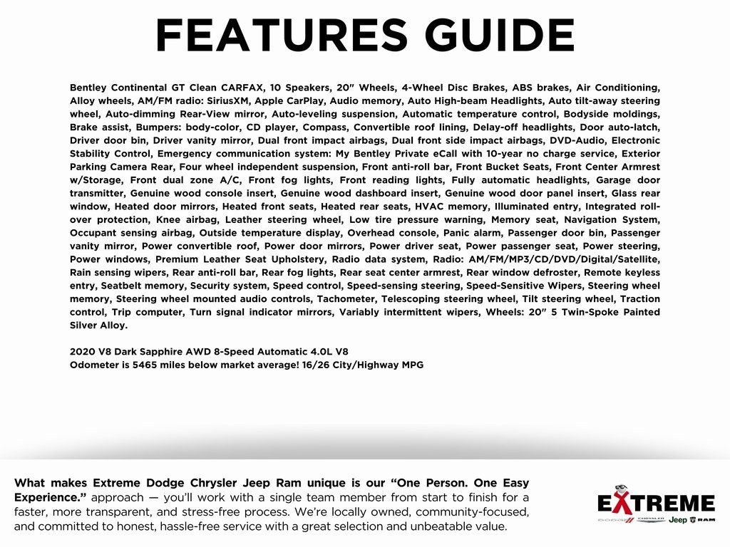 Bentley Continental GT Clean CARFAX, 10 Speakers, 20" Wheels, 4-Wheel Disc Brakes, ABS brakes, Air Conditioning, Alloy wheels, AM/FM radio: SiriusXM, Apple CarPlay, Audio memory, Auto High-beam Headlights, Auto tilt-away steering wheel, Auto-dimming Rear-View mirror, Auto-leveling suspension, Automatic temperature control, Bodyside moldings, Brake assist, Bumpers: body-color, CD player, Compass, Convertible roof lining, Delay-off headlights, Door auto-latch, Driver door bin, Driver vanity mirror, Dual front impact airbags, Dual front side impact airbags, DVD-Audio, Electronic Stability Control, Emergency communication system: My Bentley Private eCall with 10-year no charge service, Exterior Parking Camera Rear, Four wheel independent suspension, Front anti-roll bar, Front Bucket Seats, Front Center Armrest w/Storage, Front dual zone A/C, Front fog lights, Front reading lights, Fully automatic headlights, Garage door transmitter, Genuine wood console insert, Genuine wood dashboard insert, Genuine wood door panel insert, Glass rear window, Heated door mirrors, Heated front seats, Heated rear seats, HVAC memory, Illuminated entry, Integrated roll-over protection, Knee airbag, Leather steering wheel, Low tire pressure warning, Memory seat, Navigation System, Occupant sensing airbag, Outside temperature display, Overhead console, Panic alarm, Passenger door bin, Passenger vanity mirror, Power convertible roof, Power door mirrors, Power driver seat, Power passenger seat, Power steering, Power windows, Premium Leather Seat Upholstery, Radio data system, Radio: AM/FM/MP3/CD/DVD/Digital/Satellite, Rain sensing wipers, Rear anti-roll bar, Rear fog lights, Rear seat center armrest, Rear window defroster, Remote keyless entry, Seatbelt memory, Security system, Speed control, Speed-sensing steering, Speed-Sensitive Wipers, Steering wheel memory, Steering wheel mounted audio controls, Tachometer, Telescoping steering wheel, Tilt steering wheel, Traction control, Trip computer, Turn signal indicator mirrors, Variably intermittent wipers, Wheels: 20" 5 Twin-Spoke Painted Silver Alloy.