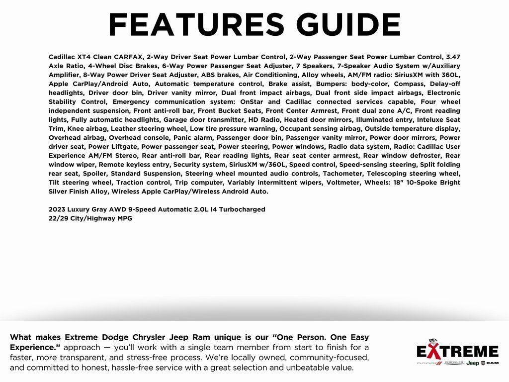 Cadillac XT4 Clean CARFAX, 2-Way Driver Seat Power Lumbar Control, 2-Way Passenger Seat Power Lumbar Control, 3.47 Axle Ratio, 4-Wheel Disc Brakes, 6-Way Power Passenger Seat Adjuster, 7 Speakers, 7-Speaker Audio System w/Auxiliary Amplifier, 8-Way Power Driver Seat Adjuster, ABS brakes, Air Conditioning, Alloy wheels, AM/FM radio: SiriusXM with 360L, Apple CarPlay/Android Auto, Automatic temperature control, Brake assist, Bumpers: body-color, Compass, Delay-off headlights, Driver door bin, Driver vanity mirror, Dual front impact airbags, Dual front side impact airbags, Electronic Stability Control, Emergency communication system: OnStar and Cadillac connected services capable, Four wheel independent suspension, Front anti-roll bar, Front Bucket Seats, Front Center Armrest, Front dual zone A/C, Front reading lights, Fully automatic headlights, Garage door transmitter, HD Radio, Heated door mirrors, Illuminated entry, Inteluxe Seat Trim, Knee airbag, Leather steering wheel, Low tire pressure warning, Occupant sensing airbag, Outside temperature display, Overhead airbag, Overhead console, Panic alarm, Passenger door bin, Passenger vanity mirror, Power door mirrors, Power driver seat, Power Liftgate, Power passenger seat, Power steering, Power windows, Radio data system, Radio: Cadillac User Experience AM/FM Stereo, Rear anti-roll bar, Rear reading lights, Rear seat center armrest, Rear window defroster, Rear window wiper, Remote keyless entry, Security system, SiriusXM w/360L, Speed control, Speed-sensing steering, Split folding rear seat, Spoiler, Standard Suspension, Steering wheel mounted audio controls, Tachometer, Telescoping steering wheel, Tilt steering wheel, Traction control, Trip computer, Variably intermittent wipers, Voltmeter, Wheels: 18" 10-Spoke Bright Silver Finish Alloy, Wireless Apple CarPlay/Wireless Android Auto.
