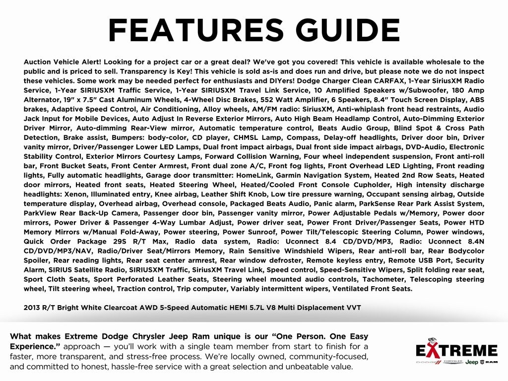 Auction Vehicle Alert! Looking for a project car or a great deal? We've got you covered! This vehicle is available wholesale to the public and is priced to sell. Transparency is Key! This vehicle is sold as-is and does run and drive, but please note we do not inspect these vehicles. Some work may be needed perfect for enthusiasts and DIYers! Dodge Charger Reserve today! Not available for final sale... awaiting title., Clean CARFAX, 1-Year SiriusXM Radio Service, 1-Year SIRIUSXM Traffic Service, 1-Year SIRIUSXM Travel Link Service, 10 Amplified Speakers w/Subwoofer, 180 Amp Alternator, 19" x 7.5" Cast Aluminum Wheels, 4-Wheel Disc Brakes, 552 Watt Amplifier, 6 Speakers, 8.4" Touch Screen Display, ABS brakes, Adaptive Speed Control, Air Conditioning, Alloy wheels, AM/FM radio: SiriusXM, Anti-whiplash front head restraints, Audio Jack Input for Mobile Devices, Auto Adjust In Reverse Exterior Mirrors, Auto High Beam Headlamp Control, Auto-Dimming Exterior Driver Mirror, Auto-dimming Rear-View mirror, Automatic temperature control, Beats Audio Group, Blind Spot & Cross Path Detection, Brake assist, Bumpers: body-color, CD player, CHMSL Lamp, Compass, Delay-off headlights, Driver door bin, Driver vanity mirror, Driver/Passenger Lower LED Lamps, Dual front impact airbags, Dual front side impact airbags, DVD-Audio, Electronic Stability Control, Exterior Mirrors Courtesy Lamps, Forward Collision Warning, Four wheel independent suspension, Front anti-roll bar, Front Bucket Seats, Front Center Armrest, Front dual zone A/C, Front fog lights, Front Overhead LED Lighting, Front reading lights, Fully automatic headlights, Garage door transmitter: HomeLink, Garmin Navigation System, Heated 2nd Row Seats, Heated door mirrors, Heated front seats, Heated Steering Wheel, Heated/Cooled Front Console Cupholder, High intensity discharge headlights: Xenon, Illuminated entry, Knee airbag, Leather Shift Knob, Low tire pressure warning, Occupant sensing airbag, Outside temperature display, Overhead airbag, Overhead console, Packaged Beats Audio, Panic alarm, ParkSense Rear Park Assist System, ParkView Rear Back-Up Camera, Passenger door bin, Passenger vanity mirror, Power Adjustable Pedals w/Memory, Power door mirrors, Power Driver & Passenger 4-Way Lumbar Adjust, Power driver seat, Power Front Driver/Passenger Seats, Power HTD Memory Mirrors w/Manual Fold-Away, Power steering, Power Sunroof, Power Tilt/Telescopic Steering Column, Power windows, Quick Order Package 29S R/T Max, Radio data system, Radio: Uconnect 8.4 CD/DVD/MP3, Radio: Uconnect 8.4N CD/DVD/MP3/NAV, Radio/Driver Seat/Mirrors Memory, Rain Sensitive Windshield Wipers, Rear anti-roll bar, Rear Bodycolor Spoiler, Rear reading lights, Rear seat center armrest, Rear window defroster, Remote keyless entry, Remote USB Port, Security Alarm, SIRIUS Satellite Radio, SIRIUSXM Traffic, SiriusXM Travel Link, Speed control, Speed-Sensitive Wipers, Split folding rear seat, Sport Cloth Seats, Sport Perforated Leather Seats, Steering wheel mounted audio controls, Tachometer, Telescoping steering wheel, Tilt steering wheel, Traction control, Trip computer, Variably intermittent wipers, Ventilated Front Seats.