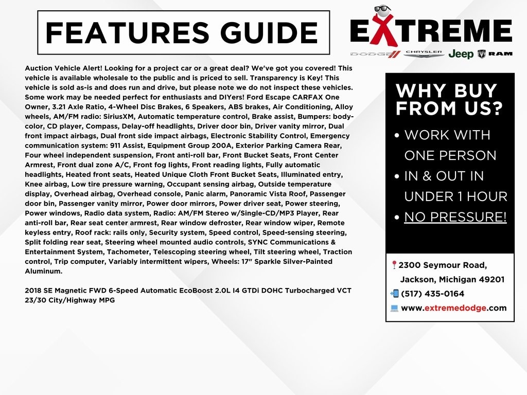 Auction Vehicle Alert! Looking for a project car or a great deal? We've got you covered! This vehicle is available wholesale to the public and is priced to sell. Transparency is Key! This vehicle is sold as-is and does run and drive, but please note we do not inspect these vehicles. Some work may be needed perfect for enthusiasts and DIYers! Ford Escape CARFAX One Owner, 3.21 Axle Ratio, 4-Wheel Disc Brakes, 6 Speakers, ABS brakes, Air Conditioning, Alloy wheels, AM/FM radio: SiriusXM, Automatic temperature control, Brake assist, Bumpers: body-color, CD player, Compass, Delay-off headlights, Driver door bin, Driver vanity mirror, Dual front impact airbags, Dual front side impact airbags, Electronic Stability Control, Emergency communication system: 911 Assist, Equipment Group 200A, Exterior Parking Camera Rear, Four wheel independent suspension, Front anti-roll bar, Front Bucket Seats, Front Center Armrest, Front dual zone A/C, Front fog lights, Front reading lights, Fully automatic headlights, Heated front seats, Heated Unique Cloth Front Bucket Seats, Illuminated entry, Knee airbag, Low tire pressure warning, Occupant sensing airbag, Outside temperature display, Overhead airbag, Overhead console, Panic alarm, Panoramic Vista Roof, Passenger door bin, Passenger vanity mirror, Power door mirrors, Power driver seat, Power steering, Power windows, Radio data system, Radio: AM/FM Stereo w/Single-CD/MP3 Player, Rear anti-roll bar, Rear seat center armrest, Rear window defroster, Rear window wiper, Remote keyless entry, Roof rack: rails only, Security system, Speed control, Speed-sensing steering, Split folding rear seat, Steering wheel mounted audio controls, SYNC Communications & Entertainment System, Tachometer, Telescoping steering wheel, Tilt steering wheel, Traction control, Trip computer, Variably intermittent wipers, Wheels: 17" Sparkle Silver-Painted Aluminum.