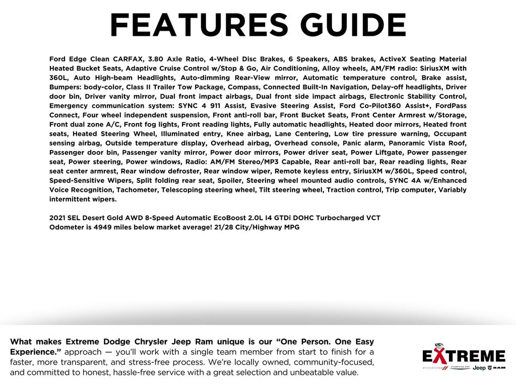 Ford Edge, Clean CARFAX, 3.80 Axle Ratio, 4-Wheel Disc Brakes, 6 Speakers, ABS brakes, ActiveX Seating Material Heated Bucket Seats, Adaptive Cruise Control w/Stop & Go, Air Conditioning, Alloy wheels, AM/FM radio: SiriusXM with 360L, Auto High-beam Headlights, Auto-dimming Rear-View mirror, Automatic temperature control, Brake assist, Bumpers: body-color, Class II Trailer Tow Package, Compass, Connected Built-In Navigation, Delay-off headlights, Driver door bin, Driver vanity mirror, Dual front impact airbags, Dual front side impact airbags, Electronic Stability Control, Emergency communication system: SYNC 4 911 Assist, Evasive Steering Assist, Ford Co-Pilot360 Assist+, FordPass Connect, Four wheel independent suspension, Front anti-roll bar, Front Bucket Seats, Front Center Armrest w/Storage, Front dual zone A/C, Front fog lights, Front reading lights, Fully automatic headlights, Heated door mirrors, Heated front seats, Heated Steering Wheel, Illuminated entry, Knee airbag, Lane Centering, Low tire pressure warning, Occupant sensing airbag, Outside temperature display, Overhead airbag, Overhead console, Panic alarm, Panoramic Vista Roof, Passenger door bin, Passenger vanity mirror, Power door mirrors, Power driver seat, Power Liftgate, Power passenger seat, Power steering, Power windows, Radio: AM/FM Stereo/MP3 Capable, Rear anti-roll bar, Rear reading lights, Rear seat center armrest, Rear window defroster, Rear window wiper, Remote keyless entry, SiriusXM w/360L, Speed control, Speed-Sensitive Wipers, Split folding rear seat, Spoiler, Steering wheel mounted audio controls, SYNC 4A w/Enhanced Voice Recognition, Tachometer, Telescoping steering wheel, Tilt steering wheel, Traction control, Trip computer, Variably intermittent wipers, Wireless Charging Pad.