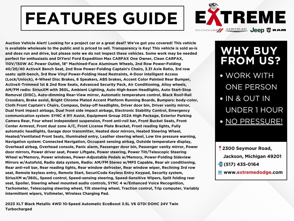 Auction Vehicle Alert! Looking for a project car or a great deal? We've got you covered! This vehicle is available wholesale to the public and is priced to sell. Transparency is Key! This vehicle is sold as-is and does run and drive, but please note we do not inspect these vehicles. Some work may be needed perfect for enthusiasts and DIYers! Ford Expedition Max CARFAX One Owner, Clean CARFAX, 110V/150W AC Power Outlet, 18" Machined-Face Aluminum Wheels, 2nd Row Power-Folding 40/20/40 ActiveX Bench Seat, 2nd Row Power-Folding Captain's Chairs, 3.31 Axle Ratio, 3rd row seats: split-bench, 3rd Row Vinyl Power-Folding Head Restraints, 4-Door Intelligent Access (Lock/Unlock), 4-Wheel Disc Brakes, 6 Speakers, ABS brakes, Accent Color Painted Rear Bumper, ActiveX-Trimmed 1st & 2nd Row Seats, Advanced Security Pack, Air Conditioning, Alloy wheels, AM/FM radio: SiriusXM with 360L, Ambient Lighting, Auto High-beam Headlights, Auto Start-Stop Removal (DISC), Auto-dimming Rear-View mirror, Automatic temperature control, Black Roof-Rail Crossbars, Brake assist, Bright Chrome Plated Accent Platform Running Boards, Bumpers: body-color, Cloth Front Captain's Chairs, Compass, Delay-off headlights, Driver door bin, Driver vanity mirror, Dual front impact airbags, Dual front side impact airbags, Electronic Stability Control, Emergency communication system: SYNC 4 911 Assist, Equipment Group 202A High Package, Exterior Parking Camera Rear, Four wheel independent suspension, Front anti-roll bar, Front Bucket Seats, Front Center Armrest, Front dual zone A/C, Front License Plate Bracket, Front reading lights, Fully automatic headlights, Garage door transmitter, Heated door mirrors, Heated Steering Wheel, Heated/Ventilated Front Seats, Illuminated entry, Leather steering wheel, Low tire pressure warning, Navigation system: Connected Navigation, Occupant sensing airbag, Outside temperature display, Overhead airbag, Overhead console, Panic alarm, Passenger door bin, Passenger vanity mirror, Power door mirrors, Power driver seat, Power Liftgate, Power steering, Power Tilt/Telescopic Steering Wheel w/Memory, Power windows, Power-Adjustable Pedals w/Memory, Power-Folding Sideview Mirrors w/Autofold, Radio data system, Radio: AM/FM Stereo w/MP3 Capable, Rear air conditioning, Rear anti-roll bar, Rear reading lights, Rear window defroster, Rear window wiper, Reclining 3rd row seat, Remote keyless entry, Remote Start, SecuriCode Keyless Entry Keypad, Security system, SiriusXM w/360L, Speed control, Speed-sensing steering, Speed-Sensitive Wipers, Split folding rear seat, Spoiler, Steering wheel mounted audio controls, SYNC 4 w/Enhanced Voice Recognition, Tachometer, Telescoping steering wheel, Tilt steering wheel, Traction control, Trip computer, Variably intermittent wipers, Voltmeter, Wireless Charging Pad.