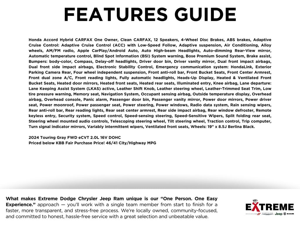 Honda Accord Hybrid CARFAX One Owner, Clean CARFAX, 12 Speakers, 4-Wheel Disc Brakes, ABS brakes, Adaptive Cruise Control: Adaptive Cruise Control (ACC) with Low-Speed Follow, Adaptive suspension, Air Conditioning, Alloy wheels, AM/FM radio, Apple CarPlay/Android Auto, Auto High-beam Headlights, Auto-dimming Rear-View mirror, Automatic temperature control, Blind Spot Information (BSI) System warning, Bose Premium Sound System, Brake assist, Bumpers: body-color, Compass, Delay-off headlights, Driver door bin, Driver vanity mirror, Dual front impact airbags, Dual front side impact airbags, Electronic Stability Control, Emergency communication system: HondaLink, Exterior Parking Camera Rear, Four wheel independent suspension, Front anti-roll bar, Front Bucket Seats, Front Center Armrest, Front dual zone A/C, Front reading lights, Fully automatic headlights, Heads-Up Display, Heated & Ventilated Front Bucket Seats, Heated door mirrors, Heated front seats, Heated rear seats, Illuminated entry, Knee airbag, Lane departure: Lane Keeping Assist System (LKAS) active, Leather Shift Knob, Leather steering wheel, Leather-Trimmed Seat Trim, Low tire pressure warning, Memory seat, Navigation System, Occupant sensing airbag, Outside temperature display, Overhead airbag, Overhead console, Panic alarm, Passenger door bin, Passenger vanity mirror, Power door mirrors, Power driver seat, Power moonroof, Power passenger seat, Power steering, Power windows, Radio data system, Rain sensing wipers, Rear anti-roll bar, Rear reading lights, Rear seat center armrest, Rear side impact airbag, Rear window defroster, Remote keyless entry, Security system, Speed control, Speed-sensing steering, Speed-Sensitive Wipers, Split folding rear seat, Steering wheel mounted audio controls, Telescoping steering wheel, Tilt steering wheel, Traction control, Trip computer, Turn signal indicator mirrors, Variably intermittent wipers, Ventilated front seats, Wheels: 19" x 8.5J Berlina Black.