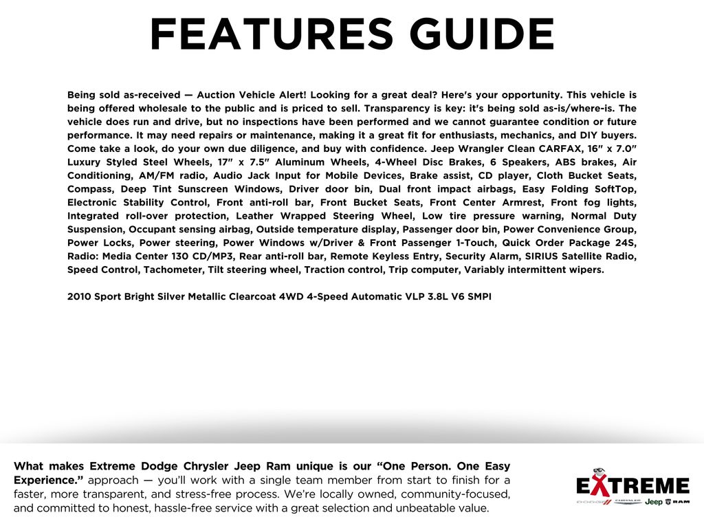 Being sold as-received â" Auction Vehicle Alert! Looking for a great deal? Hereâs your opportunity. This vehicle is being offered wholesale to the public and is priced to sell. Transparency is key: itâs being sold as-is/where-is. The vehicle does run and drive, but no inspections have been performed and we cannot guarantee condition or future performance. It may need repairs or maintenance, making it a great fit for enthusiasts, mechanics, and DIY buyers. Come take a look, do your own due diligence, and buy with confidence. Jeep Wrangler Clean CARFAX, 16" x 7.0" Luxury Styled Steel Wheels, 17" x 7.5" Aluminum Wheels, 4-Wheel Disc Brakes, 6 Speakers, ABS brakes, Air Conditioning, AM/FM radio, Audio Jack Input for Mobile Devices, Brake assist, CD player, Cloth Bucket Seats, Compass, Deep Tint Sunscreen Windows, Driver door bin, Dual front impact airbags, Easy Folding SoftTop, Electronic Stability Control, Front anti-roll bar, Front Bucket Seats, Front Center Armrest, Front fog lights, Integrated roll-over protection, Leather Wrapped Steering Wheel, Low tire pressure warning, Normal Duty Suspension, Occupant sensing airbag, Outside temperature display, Passenger door bin, Power Convenience Group, Power Locks, Power steering, Power Windows w/Driver & Front Passenger 1-Touch, Quick Order Package 24S, Radio: Media Center 130 CD/MP3, Rear anti-roll bar, Remote Keyless Entry, Security Alarm, SIRIUS Satellite Radio, Speed Control, Tachometer, Tilt steering wheel, Traction control, Trip computer, Variably intermittent wipers.