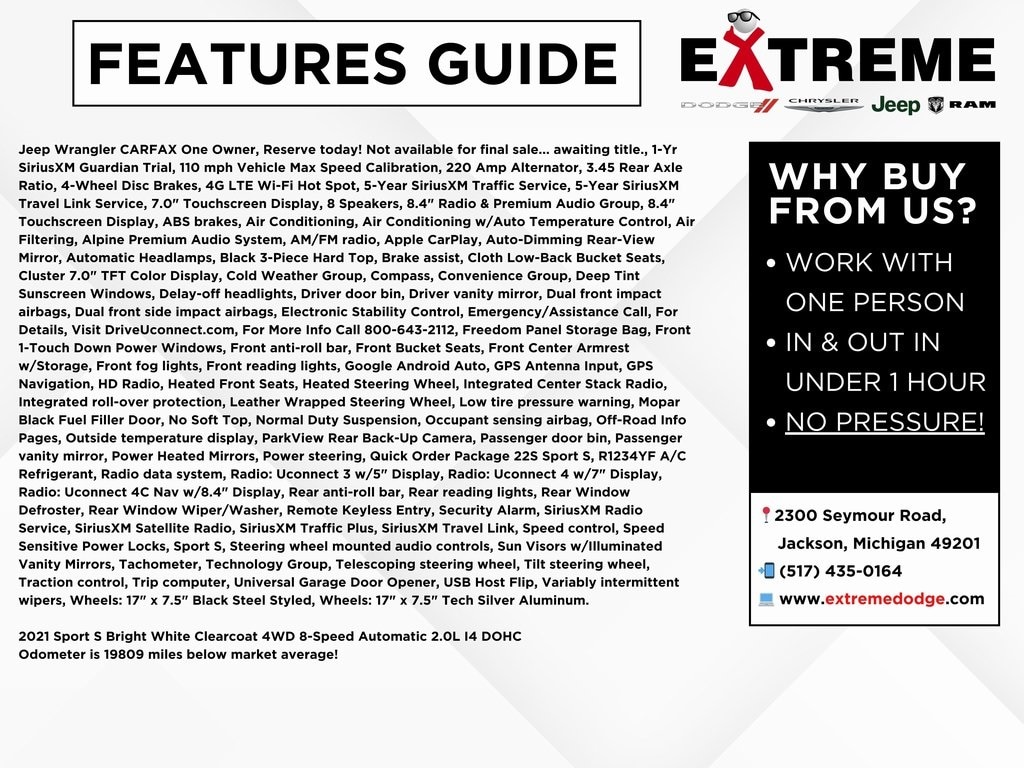 Jeep Wrangler CARFAX One Owner, Reserve today! Not available for final sale... awaiting title., 1-Yr SiriusXM Guardian Trial, 110 mph Vehicle Max Speed Calibration, 220 Amp Alternator, 3.45 Rear Axle Ratio, 4-Wheel Disc Brakes, 4G LTE Wi-Fi Hot Spot, 5-Year SiriusXM Traffic Service, 5-Year SiriusXM Travel Link Service, 7.0" Touchscreen Display, 8 Speakers, 8.4" Radio & Premium Audio Group, 8.4" Touchscreen Display, ABS brakes, Air Conditioning, Air Conditioning w/Auto Temperature Control, Air Filtering, Alpine Premium Audio System, AM/FM radio, Apple CarPlay, Auto-Dimming Rear-View Mirror, Automatic Headlamps, Black 3-Piece Hard Top, Brake assist, Cloth Low-Back Bucket Seats, Cluster 7.0" TFT Color Display, Cold Weather Group, Compass, Convenience Group, Deep Tint Sunscreen Windows, Delay-off headlights, Driver door bin, Driver vanity mirror, Dual front impact airbags, Dual front side impact airbags, Electronic Stability Control, Emergency/Assistance Call, For Details, Visit DriveUconnect.com, For More Info Call 800-643-2112, Freedom Panel Storage Bag, Front 1-Touch Down Power Windows, Front anti-roll bar, Front Bucket Seats, Front Center Armrest w/Storage, Front fog lights, Front reading lights, Google Android Auto, GPS Antenna Input, GPS Navigation, HD Radio, Heated Front Seats, Heated Steering Wheel, Integrated Center Stack Radio, Integrated roll-over protection, Leather Wrapped Steering Wheel, Low tire pressure warning, Mopar Black Fuel Filler Door, No Soft Top, Normal Duty Suspension, Occupant sensing airbag, Off-Road Info Pages, Outside temperature display, ParkView Rear Back-Up Camera, Passenger door bin, Passenger vanity mirror, Power Heated Mirrors, Power steering, Quick Order Package 22S Sport S, R1234YF A/C Refrigerant, Radio data system, Radio: Uconnect 3 w/5" Display, Radio: Uconnect 4 w/7" Display, Radio: Uconnect 4C Nav w/8.4" Display, Rear anti-roll bar, Rear reading lights, Rear Window Defroster, Rear Window Wiper/Washer, Remote Keyless Entry, Security Alarm, SiriusXM Radio Service, SiriusXM Satellite Radio, SiriusXM Traffic Plus, SiriusXM Travel Link, Speed control, Speed Sensitive Power Locks, Sport S, Steering wheel mounted audio controls, Sun Visors w/Illuminated Vanity Mirrors, Tachometer, Technology Group, Telescoping steering wheel, Tilt steering wheel, Traction control, Trip computer, Universal Garage Door Opener, USB Host Flip, Variably intermittent wipers, Wheels: 17" x 7.5" Black Steel Styled, Wheels: 17" x 7.5" Tech Silver Aluminum.