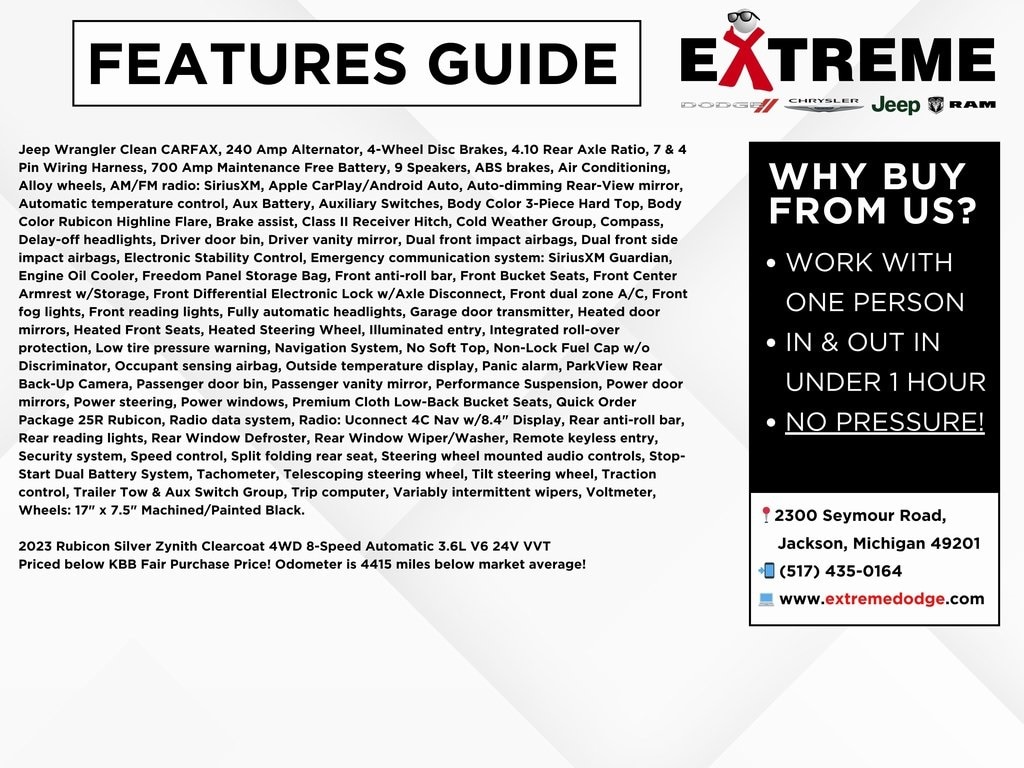 Jeep Wrangler Clean CARFAX, 240 Amp Alternator, 4-Wheel Disc Brakes, 4.10 Rear Axle Ratio, 7 & 4 Pin Wiring Harness, 700 Amp Maintenance Free Battery, 9 Speakers, ABS brakes, Air Conditioning, Alloy wheels, AM/FM radio: SiriusXM, Apple CarPlay/Android Auto, Auto-dimming Rear-View mirror, Automatic temperature control, Aux Battery, Auxiliary Switches, Body Color 3-Piece Hard Top, Body Color Rubicon Highline Flare, Brake assist, Class II Receiver Hitch, Cold Weather Group, Compass, Delay-off headlights, Driver door bin, Driver vanity mirror, Dual front impact airbags, Dual front side impact airbags, Electronic Stability Control, Emergency communication system: SiriusXM Guardian, Engine Oil Cooler, Freedom Panel Storage Bag, Front anti-roll bar, Front Bucket Seats, Front Center Armrest w/Storage, Front Differential Electronic Lock w/Axle Disconnect, Front dual zone A/C, Front fog lights, Front reading lights, Fully automatic headlights, Garage door transmitter, Heated door mirrors, Heated Front Seats, Heated Steering Wheel, Illuminated entry, Integrated roll-over protection, Low tire pressure warning, Navigation System, No Soft Top, Non-Lock Fuel Cap w/o Discriminator, Occupant sensing airbag, Outside temperature display, Panic alarm, ParkView Rear Back-Up Camera, Passenger door bin, Passenger vanity mirror, Performance Suspension, Power door mirrors, Power steering, Power windows, Premium Cloth Low-Back Bucket Seats, Quick Order Package 25R Rubicon, Radio data system, Radio: Uconnect 4C Nav w/8.4" Display, Rear anti-roll bar, Rear reading lights, Rear Window Defroster, Rear Window Wiper/Washer, Remote keyless entry, Security system, Speed control, Split folding rear seat, Steering wheel mounted audio controls, Stop-Start Dual Battery System, Tachometer, Telescoping steering wheel, Tilt steering wheel, Traction control, Trailer Tow & Aux Switch Group, Trip computer, Variably intermittent wipers, Voltmeter, Wheels: 17" x 7.5" Machined/Painted Black.