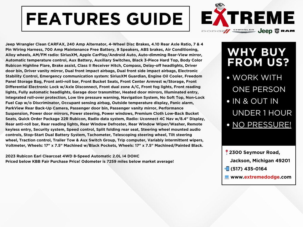 Jeep Wrangler Clean CARFAX, 240 Amp Alternator, 4-Wheel Disc Brakes, 4.10 Rear Axle Ratio, 7 & 4 Pin Wiring Harness, 700 Amp Maintenance Free Battery, 9 Speakers, ABS brakes, Air Conditioning, Alloy wheels, AM/FM radio: SiriusXM, Apple CarPlay/Android Auto, Auto-dimming Rear-View mirror, Automatic temperature control, Aux Battery, Auxiliary Switches, Black 3-Piece Hard Top, Body Color Rubicon Highline Flare, Brake assist, Class II Receiver Hitch, Compass, Delay-off headlights, Driver door bin, Driver vanity mirror, Dual front impact airbags, Dual front side impact airbags, Electronic Stability Control, Emergency communication system: SiriusXM Guardian, Engine Oil Cooler, Freedom Panel Storage Bag, Front anti-roll bar, Front Bucket Seats, Front Center Armrest w/Storage, Front Differential Electronic Lock w/Axle Disconnect, Front dual zone A/C, Front fog lights, Front reading lights, Fully automatic headlights, Garage door transmitter, Heated door mirrors, Illuminated entry, Integrated roll-over protection, Low tire pressure warning, Navigation System, No Soft Top, Non-Lock Fuel Cap w/o Discriminator, Occupant sensing airbag, Outside temperature display, Panic alarm, ParkView Rear Back-Up Camera, Passenger door bin, Passenger vanity mirror, Performance Suspension, Power door mirrors, Power steering, Power windows, Premium Cloth Low-Back Bucket Seats, Quick Order Package 22R Rubicon, Radio data system, Radio: Uconnect 4C Nav w/8.4" Display, Rear anti-roll bar, Rear reading lights, Rear Window Defroster, Rear Window Wiper/Washer, Remote keyless entry, Security system, Speed control, Split folding rear seat, Steering wheel mounted audio controls, Stop-Start Dual Battery System, Tachometer, Telescoping steering wheel, Tilt steering wheel, Traction control, Trailer Tow & Aux Switch Group, Trip computer, Variably intermittent wipers, Voltmeter, Wheels: 17" x 7.5" Machined w/Black Pockets, Wheels: 17" x 7.5" Machined/Painted Black.