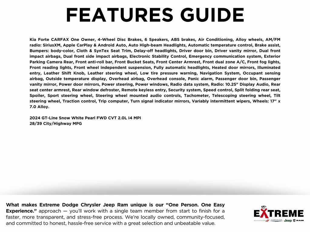 Kia Forte CARFAX One Owner, 4-Wheel Disc Brakes, 6 Speakers, ABS brakes, Air Conditioning, Alloy wheels, AM/FM radio: SiriusXM, Apple CarPlay & Android Auto, Auto High-beam Headlights, Automatic temperature control, Brake assist, Bumpers: body-color, Cloth & SynTex Seat Trim, Delay-off headlights, Driver door bin, Driver vanity mirror, Dual front impact airbags, Dual front side impact airbags, Electronic Stability Control, Emergency communication system, Exterior Parking Camera Rear, Front anti-roll bar, Front Bucket Seats, Front Center Armrest, Front dual zone A/C, Front fog lights, Front reading lights, Front wheel independent suspension, Fully automatic headlights, Heated door mirrors, Illuminated entry, Leather Shift Knob, Leather steering wheel, Low tire pressure warning, Navigation System, Occupant sensing airbag, Outside temperature display, Overhead airbag, Overhead console, Panic alarm, Passenger door bin, Passenger vanity mirror, Power door mirrors, Power steering, Power windows, Radio data system, Radio: 10.25" Display Audio, Rear seat center armrest, Rear window defroster, Remote keyless entry, Security system, Speed control, Split folding rear seat, Spoiler, Sport steering wheel, Steering wheel mounted audio controls, Tachometer, Telescoping steering wheel, Tilt steering wheel, Traction control, Trip computer, Turn signal indicator mirrors, Variably intermittent wipers, Wheels: 17" x 7.0 Alloy.