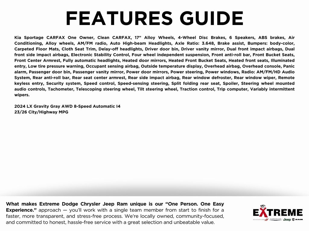 Kia Sportage CARFAX One Owner, Reserve today! Not available for final sale... awaiting title., Clean CARFAX, 17" Alloy Wheels, 4-Wheel Disc Brakes, 6 Speakers, ABS brakes, Air Conditioning, Alloy wheels, AM/FM radio, Auto High-beam Headlights, Axle Ratio: 3.648, Brake assist, Bumpers: body-color, Carpeted Floor Mats, Cloth Seat Trim, Delay-off headlights, Driver door bin, Driver vanity mirror, Dual front impact airbags, Dual front side impact airbags, Electronic Stability Control, Four wheel independent suspension, Front anti-roll bar, Front Bucket Seats, Front Center Armrest, Fully automatic headlights, Heated door mirrors, Heated Front Bucket Seats, Heated front seats, Illuminated entry, Low tire pressure warning, Occupant sensing airbag, Outside temperature display, Overhead airbag, Overhead console, Panic alarm, Passenger door bin, Passenger vanity mirror, Power door mirrors, Power steering, Power windows, Radio: AM/FM/HD Audio System, Rear anti-roll bar, Rear seat center armrest, Rear side impact airbag, Rear window defroster, Rear window wiper, Remote keyless entry, Security system, Speed control, Speed-sensing steering, Split folding rear seat, Spoiler, Steering wheel mounted audio controls, Tachometer, Telescoping steering wheel, Tilt steering wheel, Traction control, Trip computer, Variably intermittent wipers.