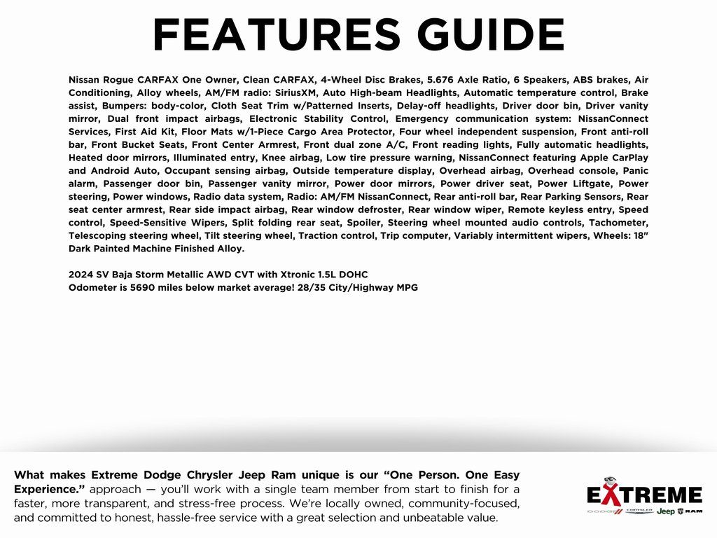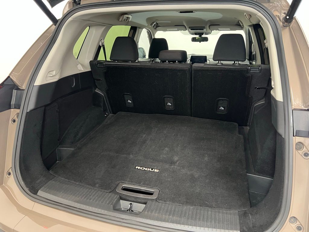Nissan Rogue CARFAX One Owner, Clean CARFAX, 4-Wheel Disc Brakes, 5.676 Axle Ratio, 6 Speakers, ABS brakes, Air Conditioning, Alloy wheels, AM/FM radio: SiriusXM, Auto High-beam Headlights, Automatic temperature control, Brake assist, Bumpers: body-color, Cloth Seat Trim w/Patterned Inserts, Delay-off headlights, Driver door bin, Driver vanity mirror, Dual front impact airbags, Electronic Stability Control, Emergency communication system: NissanConnect Services, First Aid Kit, Floor Mats w/1-Piece Cargo Area Protector, Four wheel independent suspension, Front anti-roll bar, Front Bucket Seats, Front Center Armrest, Front dual zone A/C, Front reading lights, Fully automatic headlights, Heated door mirrors, Illuminated entry, Knee airbag, Low tire pressure warning, NissanConnect featuring Apple CarPlay and Android Auto, Occupant sensing airbag, Outside temperature display, Overhead airbag, Overhead console, Panic alarm, Passenger door bin, Passenger vanity mirror, Power door mirrors, Power driver seat, Power Liftgate, Power steering, Power windows, Radio data system, Radio: AM/FM NissanConnect, Rear anti-roll bar, Rear Parking Sensors, Rear seat center armrest, Rear side impact airbag, Rear window defroster, Rear window wiper, Remote keyless entry, Speed control, Speed-Sensitive Wipers, Split folding rear seat, Spoiler, Steering wheel mounted audio controls, Tachometer, Telescoping steering wheel, Tilt steering wheel, Traction control, Trip computer, Variably intermittent wipers, Wheels: 18" Dark Painted Machine Finished Alloy.