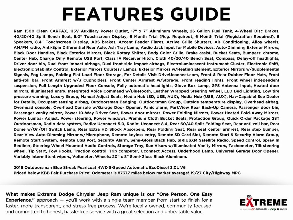 Ram 1500 Clean CARFAX, 115V Auxiliary Power Outlet, 17" x 7" Aluminum Wheels, 26 Gallon Fuel Tank, 4-Wheel Disc Brakes, 40/20/40 Split Bench Seat, 5.0" Touchscreen Display, 6 Month Trial (Reg. Required), 6 Month Trial (Registration Required), 6 Speakers, 8.4" Touchscreen Display, ABS brakes, Accent Fender Flares, Active Grille Shutters, Air Conditioning, Alloy wheels, AM/FM radio, Anti-Spin Differential Rear Axle, Ash Tray Lamp, Audio Jack Input for Mobile Devices, Auto-Dimming Exterior Mirrors, Black Door Handles, Black Exterior Mirrors, Black Rotary Shifter, Body Color Grille, Brake assist, Bucket Seats, Bumpers: chrome, Center Hub, Charge Only Remote USB Port, Class IV Receiver Hitch, Cloth 40/20/40 Bench Seat, Compass, Delay-off headlights, Driver door bin, Dual front impact airbags, Dual front side impact airbags, Electroluminescent Instrument Cluster, Electronic Shift, Electronic Stability Control, Exterior Mirrors Courtesy Lamps, Exterior Mirrors w/Heating Element, Exterior Mirrors w/Supplemental Signals, Fog Lamps, Folding Flat Load Floor Storage, For Details Visit DriveUconnect.com, Front & Rear Rubber Floor Mats, Front anti-roll bar, Front Armrest w/3 Cupholders, Front Center Armrest w/Storage, Front reading lights, Front wheel independent suspension, Full Length Upgraded Floor Console, Fully automatic headlights, Glove Box Lamp, GPS Antenna Input, Heated door mirrors, Illuminated entry, Integrated Voice Command w/Bluetooth, Leather Wrapped Steering Wheel, LED Bed Lighting, Low tire pressure warning, Luxury Group, Manual Adjust Seats, Media Hub (SD, USB, AUX), Media Hub (USB, AUX), Nav-Capable! See Dealer for Details, Occupant sensing airbag, Outdoorsman Badging, Outdoorsman Group, Outside temperature display, Overhead airbag, Overhead console, Overhead Console w/Garage Door Opener, Panic alarm, ParkView Rear Back-Up Camera, Passenger door bin, Passenger vanity mirror, Power 10-Way Driver Seat, Power door mirrors, Power Folding Mirrors, Power Heated Fold-Away Mirrors, Power Lumbar Adjust, Power steering, Power windows, Premium Cloth Bucket Seats, Protection Group, Quick Order Package 28T Outdoorsman, Radio data system, Radio: Uconnect 5.0, Radio: Uconnect 8.4, Rear 60/40 Split Folding Seat, Rear anti-roll bar, Rear Dome w/On/Off Switch Lamp, Rear Extra HD Shock Absorbers, Rear Folding Seat, Rear seat center armrest, Rear step bumper, Rear-View Auto-Dimming Mirror w/Microphone, Remote keyless entry, Remote SD Card Slot, Remote Start & Security Alarm Group, Remote Start System, Remote USB Port, Security Alarm, Semi-Gloss Black Hub, SIRIUSXM Satellite Radio, Speed control, Spray In Bedliner, Steering Wheel Mounted Audio Controls, Storage Tray, Sun Visors w/Illuminated Vanity Mirrors, Tachometer, Tilt steering wheel, Tip Start, Tow Hooks, Traction control, Trip computer, Uconnect Access, Underhood Lamp, Universal Garage Door Opener, Variably intermittent wipers, Voltmeter, Wheels: 20" x 8" Semi-Gloss Black Aluminum.
