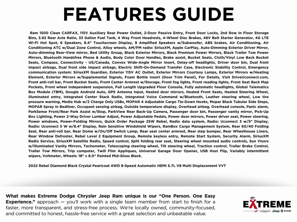 2022 Rebel Diamond Black Crystal Pearlcoat 4WD 8-Speed Automatic HEMI 5.7L V8 Multi Displacement VVT
