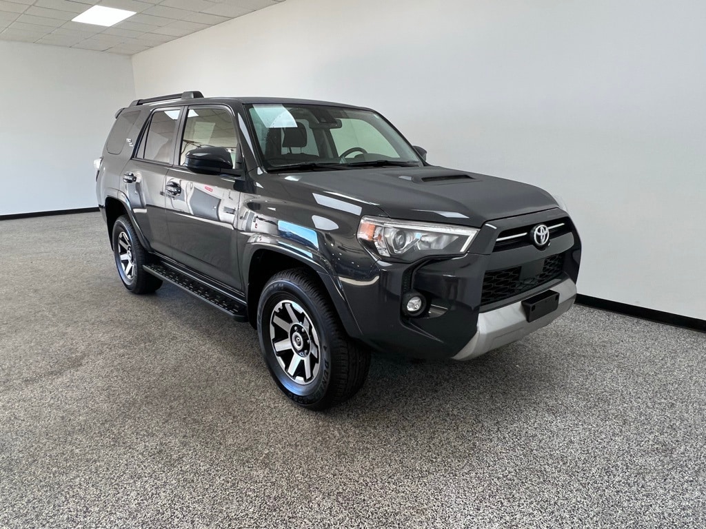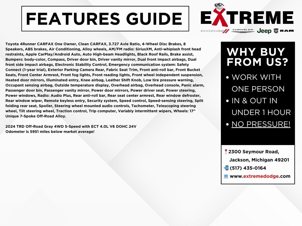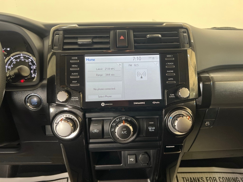 Toyota 4Runner CARFAX One Owner, Clean CARFAX, 3.727 Axle Ratio, 4-Wheel Disc Brakes, 8 Speakers, ABS brakes, Air Conditioning, Alloy wheels, AM/FM radio: SiriusXM, Anti-whiplash front head restraints, Apple CarPlay/Android Auto, Auto High-beam Headlights, Black Roof Rails, Brake assist, Bumpers: body-color, Compass, Driver door bin, Driver vanity mirror, Dual front impact airbags, Dual front side impact airbags, Electronic Stability Control, Emergency communication system: Safety Connect (1-year trial), Exterior Parking Camera Rear, Fabric Seat Trim, Front anti-roll bar, Front Bucket Seats, Front Center Armrest, Front fog lights, Front reading lights, Front wheel independent suspension, Heated door mirrors, Illuminated entry, Knee airbag, Leather Shift Knob, Low tire pressure warning, Occupant sensing airbag, Outside temperature display, Overhead airbag, Overhead console, Panic alarm, Passenger door bin, Passenger vanity mirror, Power door mirrors, Power driver seat, Power steering, Power windows, Radio: Audio Plus, Rear anti-roll bar, Rear seat center armrest, Rear window defroster, Rear window wiper, Remote keyless entry, Security system, Speed control, Speed-sensing steering, Split folding rear seat, Spoiler, Steering wheel mounted audio controls, Tachometer, Telescoping steering wheel, Tilt steering wheel, Traction control, Trip computer, Variably intermittent wipers, Wheels: 17" Unique 7-Spoke Off-Road Alloy.