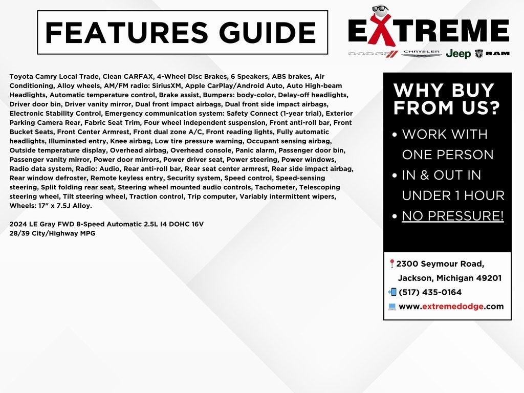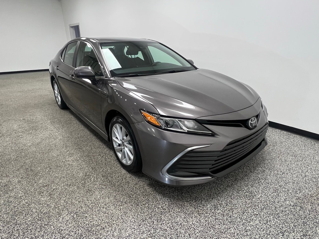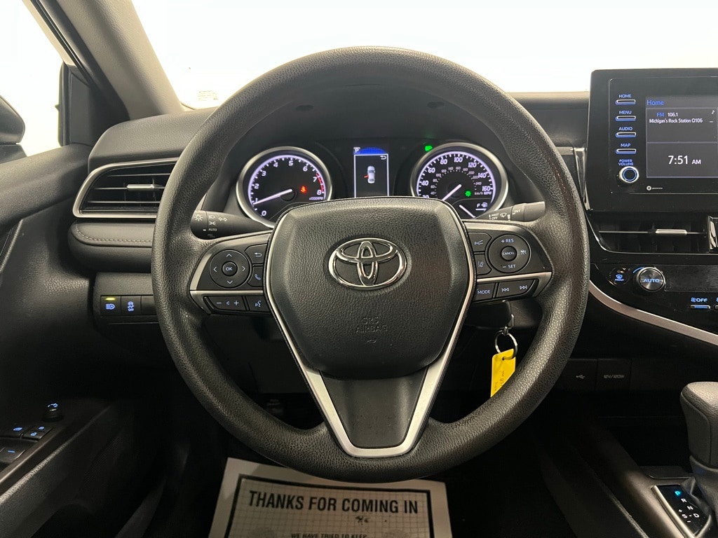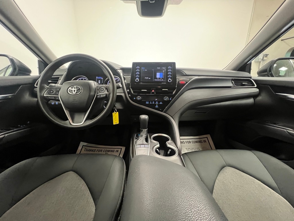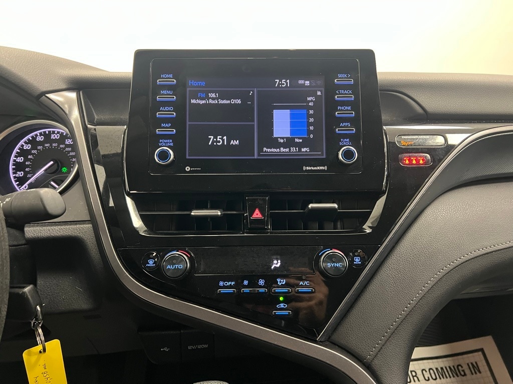 Toyota Camry Local Trade, Clean CARFAX, 4-Wheel Disc Brakes, 6 Speakers, ABS brakes, Air Conditioning, Alloy wheels, AM/FM radio: SiriusXM, Apple CarPlay/Android Auto, Auto High-beam Headlights, Automatic temperature control, Brake assist, Bumpers: body-color, Delay-off headlights, Driver door bin, Driver vanity mirror, Dual front impact airbags, Dual front side impact airbags, Electronic Stability Control, Emergency communication system: Safety Connect (1-year trial), Exterior Parking Camera Rear, Fabric Seat Trim, Four wheel independent suspension, Front anti-roll bar, Front Bucket Seats, Front Center Armrest, Front dual zone A/C, Front reading lights, Fully automatic headlights, Illuminated entry, Knee airbag, Low tire pressure warning, Occupant sensing airbag, Outside temperature display, Overhead airbag, Overhead console, Panic alarm, Passenger door bin, Passenger vanity mirror, Power door mirrors, Power driver seat, Power steering, Power windows, Radio data system, Radio: Audio, Rear anti-roll bar, Rear seat center armrest, Rear side impact airbag, Rear window defroster, Remote keyless entry, Security system, Speed control, Speed-sensing steering, Split folding rear seat, Steering wheel mounted audio controls, Tachometer, Telescoping steering wheel, Tilt steering wheel, Traction control, Trip computer, Variably intermittent wipers, Wheels: 17" x 7.5J Alloy.