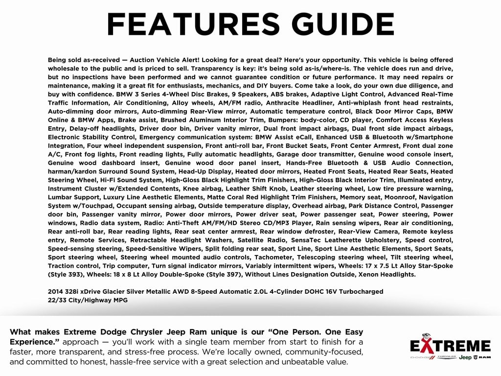 Being sold as-received â" Auction Vehicle Alert! Looking for a great deal? Hereâs your opportunity. This vehicle is being offered wholesale to the public and is priced to sell. Transparency is key: itâs being sold as-is/where-is. The vehicle does run and drive, but no inspections have been performed and we cannot guarantee condition or future performance. It may need repairs or maintenance, making it a great fit for enthusiasts, mechanics, and DIY buyers. Come take a look, do your own due diligence, and buy with confidence. BMW 3 Series 4-Wheel Disc Brakes, 9 Speakers, ABS brakes, Adaptive Light Control, Advanced Real-Time Traffic Information, Air Conditioning, Alloy wheels, AM/FM radio, Anthracite Headliner, Anti-whiplash front head restraints, Auto-dimming door mirrors, Auto-dimming Rear-View mirror, Automatic temperature control, Black Door Mirror Caps, BMW Online & BMW Apps, Brake assist, Brushed Aluminum Interior Trim, Bumpers: body-color, CD player, Comfort Access Keyless Entry, Delay-off headlights, Driver door bin, Driver vanity mirror, Dual front impact airbags, Dual front side impact airbags, Electronic Stability Control, Emergency communication system: BMW Assist eCall, Enhanced USB & Bluetooth w/Smartphone Integration, Four wheel independent suspension, Front anti-roll bar, Front Bucket Seats, Front Center Armrest, Front dual zone A/C, Front fog lights, Front reading lights, Fully automatic headlights, Garage door transmitter, Genuine wood console insert, Genuine wood dashboard insert, Genuine wood door panel insert, Hands-Free Bluetooth & USB Audio Connection, harman/kardon Surround Sound System, Head-Up Display, Heated door mirrors, Heated Front Seats, Heated Rear Seats, Heated Steering Wheel, Hi-Fi Sound System, High-Gloss Black Highlight Trim Finishers, High-Gloss Black Interior Trim, Illuminated entry, Instrument Cluster w/Extended Contents, Knee airbag, Leather Shift Knob, Leather steering wheel, Low tire pressure warning, Lumbar Support, Luxury Line Aesthetic Elements, Matte Coral Red Highlight Trim Finishers, Memory seat, Moonroof, Navigation System w/Touchpad, Occupant sensing airbag, Outside temperature display, Overhead airbag, Park Distance Control, Passenger door bin, Passenger vanity mirror, Power door mirrors, Power driver seat, Power passenger seat, Power steering, Power windows, Radio data system, Radio: Anti-Theft AM/FM/HD Stereo CD/MP3 Player, Rain sensing wipers, Rear air conditioning, Rear anti-roll bar, Rear reading lights, Rear seat center armrest, Rear window defroster, Rear-View Camera, Remote keyless entry, Remote Services, Retractable Headlight Washers, Satellite Radio, SensaTec Leatherette Upholstery, Speed control, Speed-sensing steering, Speed-Sensitive Wipers, Split folding rear seat, Sport Line, Sport Line Aesthetic Elements, Sport Seats, Sport steering wheel, Steering wheel mounted audio controls, Tachometer, Telescoping steering wheel, Tilt steering wheel, Traction control, Trip computer, Turn signal indicator mirrors, Variably intermittent wipers, Wheels: 17 x 7.5 Lt Alloy Star-Spoke (Style 393), Wheels: 18 x 8 Lt Alloy Double-Spoke (Style 397), Without Lines Designation Outside, Xenon Headlights.