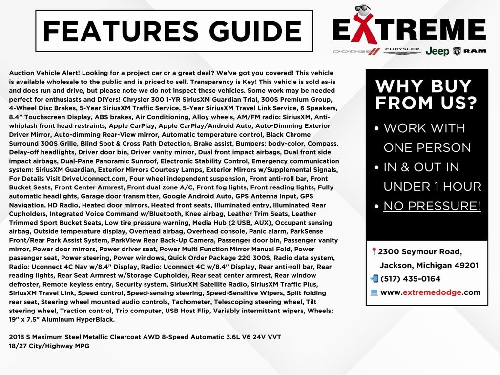 Auction Vehicle Alert! Looking for a project car or a great deal? We've got you covered! This vehicle is available wholesale to the public and is priced to sell. Transparency is Key! This vehicle is sold as-is and does run and drive, but please note we do not inspect these vehicles. Some work may be needed perfect for enthusiasts and DIYers! Chrysler 300 1-YR SiriusXM Guardian Trial, 300S Premium Group, 4-Wheel Disc Brakes, 5-Year SiriusXM Traffic Service, 5-Year SiriusXM Travel Link Service, 6 Speakers, 8.4" Touchscreen Display, ABS brakes, Air Conditioning, Alloy wheels, AM/FM radio: SiriusXM, Anti-whiplash front head restraints, Apple CarPlay, Apple CarPlay/Android Auto, Auto-Dimming Exterior Driver Mirror, Auto-dimming Rear-View mirror, Automatic temperature control, Black Chrome Surround 300S Grille, Blind Spot & Cross Path Detection, Brake assist, Bumpers: body-color, Compass, Delay-off headlights, Driver door bin, Driver vanity mirror, Dual front impact airbags, Dual front side impact airbags, Dual-Pane Panoramic Sunroof, Electronic Stability Control, Emergency communication system: SiriusXM Guardian, Exterior Mirrors Courtesy Lamps, Exterior Mirrors w/Supplemental Signals, For Details Visit DriveUconnect.com, Four wheel independent suspension, Front anti-roll bar, Front Bucket Seats, Front Center Armrest, Front dual zone A/C, Front fog lights, Front reading lights, Fully automatic headlights, Garage door transmitter, Google Android Auto, GPS Antenna Input, GPS Navigation, HD Radio, Heated door mirrors, Heated front seats, Illuminated entry, Illuminated Rear Cupholders, Integrated Voice Command w/Bluetooth, Knee airbag, Leather Trim Seats, Leather Trimmed Sport Bucket Seats, Low tire pressure warning, Media Hub (2 USB, AUX), Occupant sensing airbag, Outside temperature display, Overhead airbag, Overhead console, Panic alarm, ParkSense Front/Rear Park Assist System, ParkView Rear Back-Up Camera, Passenger door bin, Passenger vanity mirror, Power door mirrors, Power driver seat, Power Multi Function Mirror Manual Fold, Power passenger seat, Power steering, Power windows, Quick Order Package 22G 300S, Radio data system, Radio: Uconnect 4C Nav w/8.4" Display, Radio: Uconnect 4C w/8.4" Display, Rear anti-roll bar, Rear reading lights, Rear Seat Armrest w/Storage Cupholder, Rear seat center armrest, Rear window defroster, Remote keyless entry, Security system, SiriusXM Satellite Radio, SiriusXM Traffic Plus, SiriusXM Travel Link, Speed control, Speed-sensing steering, Speed-Sensitive Wipers, Split folding rear seat, Steering wheel mounted audio controls, Tachometer, Telescoping steering wheel, Tilt steering wheel, Traction control, Trip computer, USB Host Flip, Variably intermittent wipers, Wheels: 19" x 7.5" Aluminum HyperBlack.