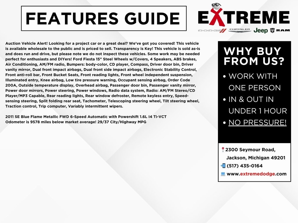 Auction Vehicle Alert! Looking for a project car or a great deal? We've got you covered! This vehicle is available wholesale to the public and is priced to sell. Transparency is Key! This vehicle is sold as-is and does run and drive, but please note we do not inspect these vehicles. Some work may be needed perfect for enthusiasts and DIYers! Ford Fiesta 15" Steel Wheels w/Covers, 4 Speakers, ABS brakes, Air Conditioning, AM/FM radio, Bumpers: body-color, CD player, Compass, Driver door bin, Driver vanity mirror, Dual front impact airbags, Dual front side impact airbags, Electronic Stability Control, Front anti-roll bar, Front Bucket Seats, Front reading lights, Front wheel independent suspension, Illuminated entry, Knee airbag, Low tire pressure warning, Occupant sensing airbag, Order Code 200A, Outside temperature display, Overhead airbag, Passenger door bin, Passenger vanity mirror, Power door mirrors, Power steering, Power windows, Radio data system, Radio: AM/FM Stereo/CD Player/MP3 Capable, Rear reading lights, Rear window defroster, Remote keyless entry, Speed-sensing steering, Split folding rear seat, Tachometer, Telescoping steering wheel, Tilt steering wheel, Traction control, Trip computer, Variably intermittent wipers.