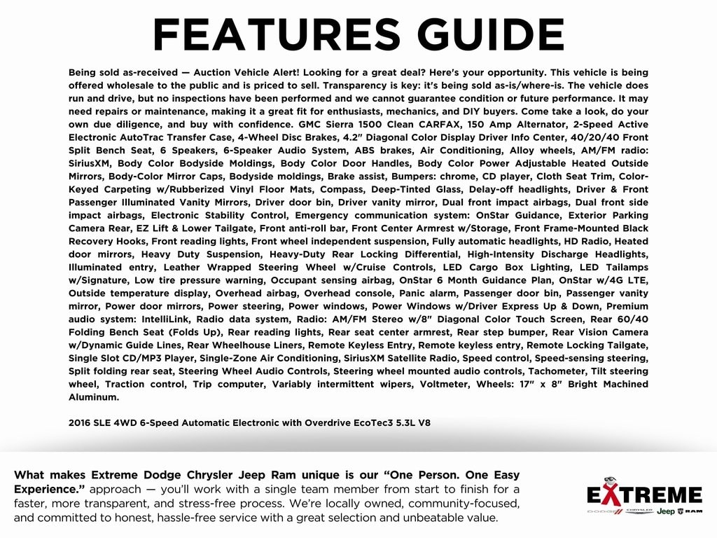 Being sold as-received â" Auction Vehicle Alert! Looking for a great deal? Hereâs your opportunity. This vehicle is being offered wholesale to the public and is priced to sell. Transparency is key: itâs being sold as-is/where-is. The vehicle does run and drive, but no inspections have been performed and we cannot guarantee condition or future performance. It may need repairs or maintenance, making it a great fit for enthusiasts, mechanics, and DIY buyers. Come take a look, do your own due diligence, and buy with confidence. GMC Sierra 1500 Clean CARFAX, 150 Amp Alternator, 2-Speed Active Electronic AutoTrac Transfer Case, 4-Wheel Disc Brakes, 4.2" Diagonal Color Display Driver Info Center, 40/20/40 Front Split Bench Seat, 6 Speakers, 6-Speaker Audio System, ABS brakes, Air Conditioning, Alloy wheels, AM/FM radio: SiriusXM, Body Color Bodyside Moldings, Body Color Door Handles, Body Color Power Adjustable Heated Outside Mirrors, Body-Color Mirror Caps, Bodyside moldings, Brake assist, Bumpers: chrome, CD player, Cloth Seat Trim, Color-Keyed Carpeting w/Rubberized Vinyl Floor Mats, Compass, Deep-Tinted Glass, Delay-off headlights, Driver & Front Passenger Illuminated Vanity Mirrors, Driver door bin, Driver vanity mirror, Dual front impact airbags, Dual front side impact airbags, Electronic Stability Control, Emergency communication system: OnStar Guidance, Exterior Parking Camera Rear, EZ Lift & Lower Tailgate, Front anti-roll bar, Front Center Armrest w/Storage, Front Frame-Mounted Black Recovery Hooks, Front reading lights, Front wheel independent suspension, Fully automatic headlights, HD Radio, Heated door mirrors, Heavy Duty Suspension, Heavy-Duty Rear Locking Differential, High-Intensity Discharge Headlights, Illuminated entry, Leather Wrapped Steering Wheel w/Cruise Controls, LED Cargo Box Lighting, LED Tailamps w/Signature, Low tire pressure warning, Occupant sensing airbag, OnStar 6 Month Guidance Plan, OnStar w/4G LTE, Outside temperature display, Overhead airbag, Overhead console, Panic alarm, Passenger door bin, Passenger vanity mirror, Power door mirrors, Power steering, Power windows, Power Windows w/Driver Express Up & Down, Premium audio system: IntelliLink, Radio data system, Radio: AM/FM Stereo w/8" Diagonal Color Touch Screen, Rear 60/40 Folding Bench Seat (Folds Up), Rear reading lights, Rear seat center armrest, Rear step bumper, Rear Vision Camera w/Dynamic Guide Lines, Rear Wheelhouse Liners, Remote Keyless Entry, Remote keyless entry, Remote Locking Tailgate, Single Slot CD/MP3 Player, Single-Zone Air Conditioning, SiriusXM Satellite Radio, Speed control, Speed-sensing steering, Split folding rear seat, Steering Wheel Audio Controls, Steering wheel mounted audio controls, Tachometer, Tilt steering wheel, Traction control, Trip computer, Variably intermittent wipers, Voltmeter, Wheels: 17" x 8" Bright Machined Aluminum.