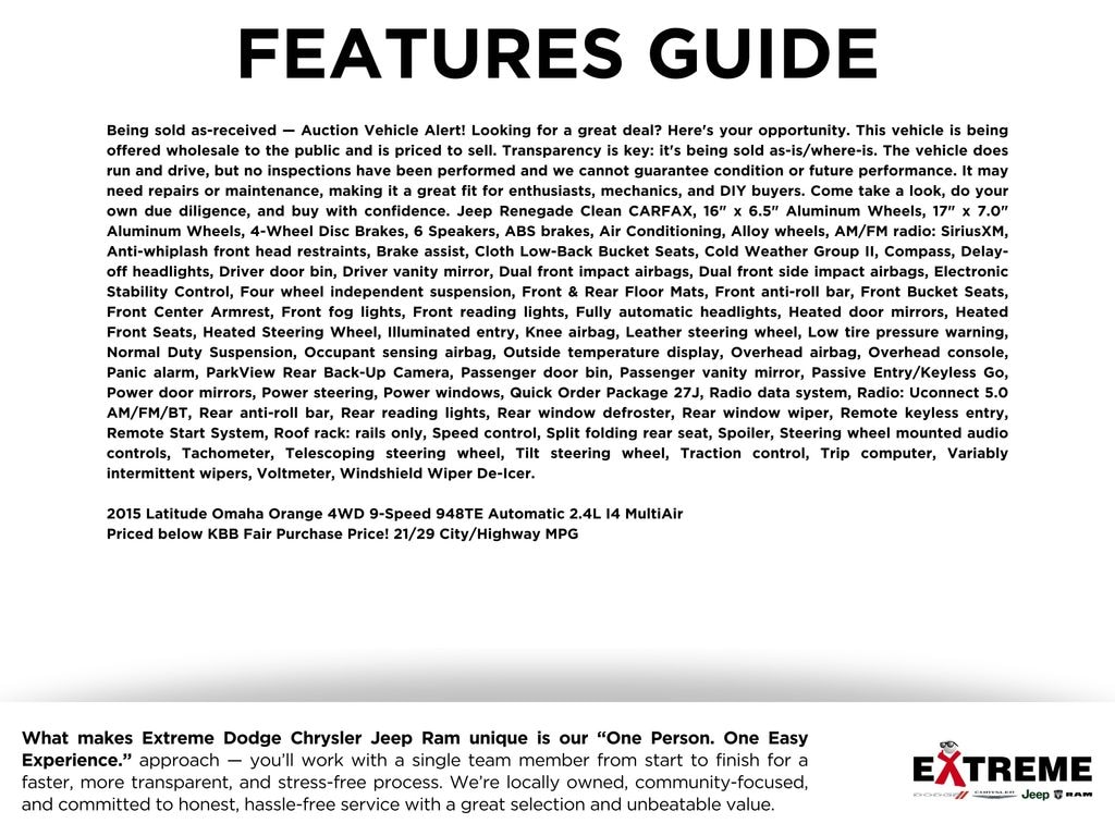 Being sold as-received â" Auction Vehicle Alert! Looking for a great deal? Hereâs your opportunity. This vehicle is being offered wholesale to the public and is priced to sell. Transparency is key: itâs being sold as-is/where-is. The vehicle does run and drive, but no inspections have been performed and we cannot guarantee condition or future performance. It may need repairs or maintenance, making it a great fit for enthusiasts, mechanics, and DIY buyers. Come take a look, do your own due diligence, and buy with confidence. Jeep Renegade Reserve today! Not available for final sale... awaiting title., Clean CARFAX, 16" x 6.5" Aluminum Wheels, 17" x 7.0" Aluminum Wheels, 4-Wheel Disc Brakes, 6 Speakers, ABS brakes, Air Conditioning, Alloy wheels, AM/FM radio: SiriusXM, Anti-whiplash front head restraints, Brake assist, Cloth Low-Back Bucket Seats, Cold Weather Group II, Compass, Delay-off headlights, Driver door bin, Driver vanity mirror, Dual front impact airbags, Dual front side impact airbags, Electronic Stability Control, Four wheel independent suspension, Front & Rear Floor Mats, Front anti-roll bar, Front Bucket Seats, Front Center Armrest, Front fog lights, Front reading lights, Fully automatic headlights, Heated door mirrors, Heated Front Seats, Heated Steering Wheel, Illuminated entry, Knee airbag, Leather steering wheel, Low tire pressure warning, Normal Duty Suspension, Occupant sensing airbag, Outside temperature display, Overhead airbag, Overhead console, Panic alarm, ParkView Rear Back-Up Camera, Passenger door bin, Passenger vanity mirror, Passive Entry/Keyless Go, Power door mirrors, Power steering, Power windows, Quick Order Package 27J, Radio data system, Radio: Uconnect 5.0 AM/FM/BT, Rear anti-roll bar, Rear reading lights, Rear window defroster, Rear window wiper, Remote keyless entry, Remote Start System, Roof rack: rails only, Speed control, Split folding rear seat, Spoiler, Steering wheel mounted audio controls, Tachometer, Telescoping steering wheel, Tilt steering wheel, Traction control, Trip computer, Variably intermittent wipers, Voltmeter, Windshield Wiper De-Icer.