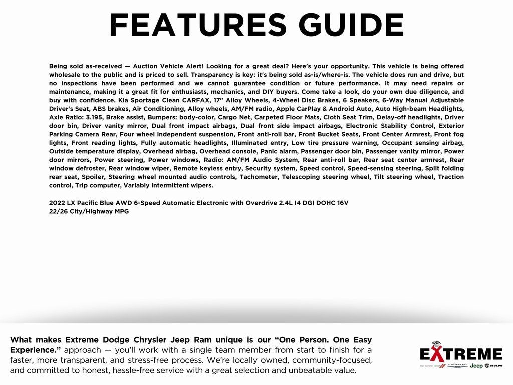 Being sold as-received â" Auction Vehicle Alert! Looking for a great deal? Hereâs your opportunity. This vehicle is being offered wholesale to the public and is priced to sell. Transparency is key: itâs being sold as-is/where-is. The vehicle does run and drive, but no inspections have been performed and we cannot guarantee condition or future performance. It may need repairs or maintenance, making it a great fit for enthusiasts, mechanics, and DIY buyers. Come take a look, do your own due diligence, and buy with confidence. Kia Sportage Reserve today! Not available for final sale... awaiting title., Clean CARFAX, 17" Alloy Wheels, 4-Wheel Disc Brakes, 6 Speakers, 6-Way Manual Adjustable Driver's Seat, ABS brakes, Air Conditioning, Alloy wheels, AM/FM radio, Apple CarPlay & Android Auto, Auto High-beam Headlights, Axle Ratio: 3.195, Brake assist, Bumpers: body-color, Cargo Net, Carpeted Floor Mats, Cloth Seat Trim, Delay-off headlights, Driver door bin, Driver vanity mirror, Dual front impact airbags, Dual front side impact airbags, Electronic Stability Control, Exterior Parking Camera Rear, Four wheel independent suspension, Front anti-roll bar, Front Bucket Seats, Front Center Armrest, Front fog lights, Front reading lights, Fully automatic headlights, Illuminated entry, Low tire pressure warning, Occupant sensing airbag, Outside temperature display, Overhead airbag, Overhead console, Panic alarm, Passenger door bin, Passenger vanity mirror, Power door mirrors, Power steering, Power windows, Radio: AM/FM Audio System, Rear anti-roll bar, Rear seat center armrest, Rear window defroster, Rear window wiper, Remote keyless entry, Security system, Speed control, Speed-sensing steering, Split folding rear seat, Spoiler, Steering wheel mounted audio controls, Tachometer, Telescoping steering wheel, Tilt steering wheel, Traction control, Trip computer, Variably intermittent wipers.
