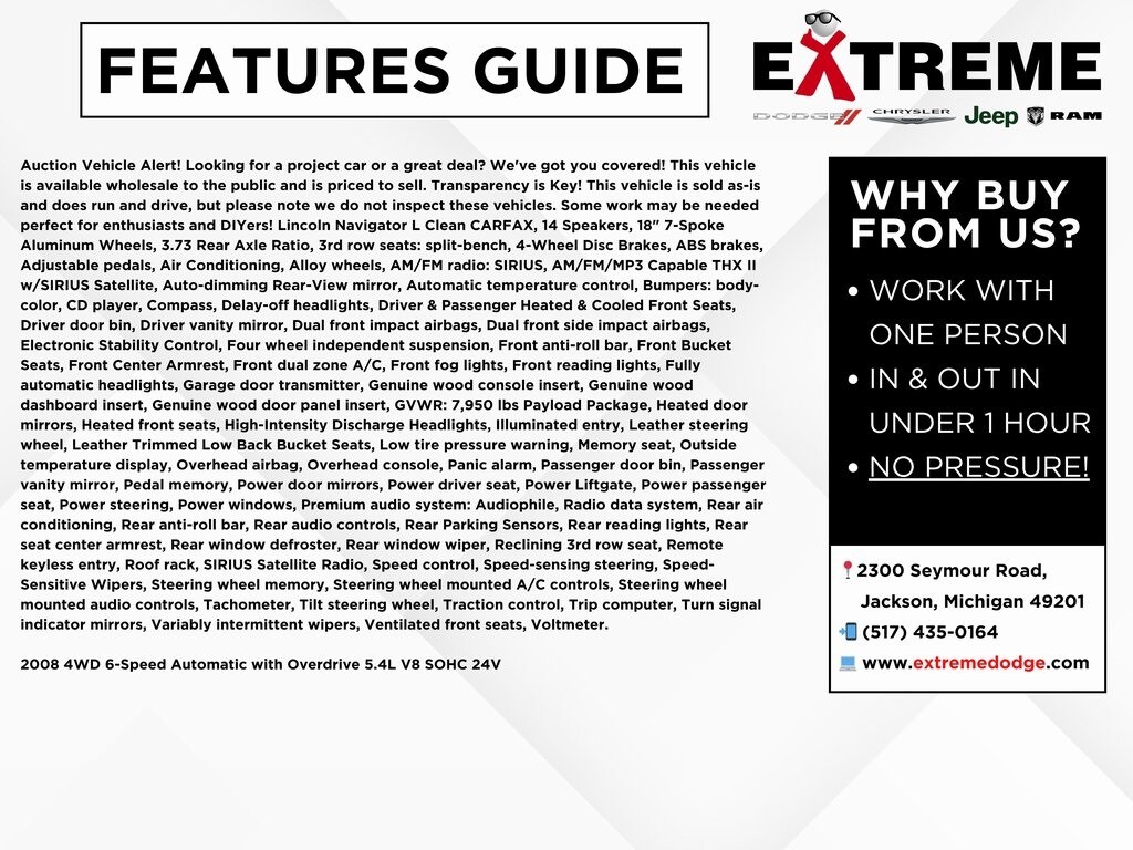 Auction Vehicle Alert! Looking for a project car or a great deal? We've got you covered! This vehicle is available wholesale to the public and is priced to sell. Transparency is Key! This vehicle is sold as-is and does run and drive, but please note we do not inspect these vehicles. Some work may be needed perfect for enthusiasts and DIYers! Lincoln Navigator L Clean CARFAX, 14 Speakers, 18" 7-Spoke Aluminum Wheels, 3.73 Rear Axle Ratio, 3rd row seats: split-bench, 4-Wheel Disc Brakes, ABS brakes, Adjustable pedals, Air Conditioning, Alloy wheels, AM/FM radio: SIRIUS, AM/FM/MP3 Capable THX II w/SIRIUS Satellite, Auto-dimming Rear-View mirror, Automatic temperature control, Bumpers: body-color, CD player, Compass, Delay-off headlights, Driver & Passenger Heated & Cooled Front Seats, Driver door bin, Driver vanity mirror, Dual front impact airbags, Dual front side impact airbags, Electronic Stability Control, Four wheel independent suspension, Front anti-roll bar, Front Bucket Seats, Front Center Armrest, Front dual zone A/C, Front fog lights, Front reading lights, Fully automatic headlights, Garage door transmitter, Genuine wood console insert, Genuine wood dashboard insert, Genuine wood door panel insert, GVWR: 7,950 lbs Payload Package, Heated door mirrors, Heated front seats, High-Intensity Discharge Headlights, Illuminated entry, Leather steering wheel, Leather Trimmed Low Back Bucket Seats, Low tire pressure warning, Memory seat, Outside temperature display, Overhead airbag, Overhead console, Panic alarm, Passenger door bin, Passenger vanity mirror, Pedal memory, Power door mirrors, Power driver seat, Power Liftgate, Power passenger seat, Power steering, Power windows, Premium audio system: Audiophile, Radio data system, Rear air conditioning, Rear anti-roll bar, Rear audio controls, Rear Parking Sensors, Rear reading lights, Rear seat center armrest, Rear window defroster, Rear window wiper, Reclining 3rd row seat, Remote keyless entry, Roof rack, SIRIUS Satellite Radio, Speed control, Speed-sensing steering, Speed-Sensitive Wipers, Steering wheel memory, Steering wheel mounted A/C controls, Steering wheel mounted audio controls, Tachometer, Tilt steering wheel, Traction control, Trip computer, Turn signal indicator mirrors, Variably intermittent wipers, Ventilated front seats, Voltmeter.
