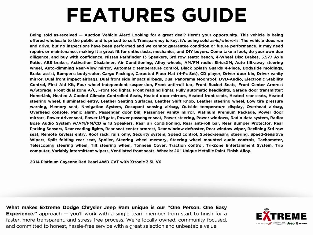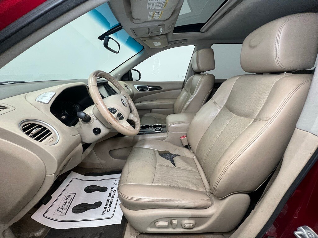 Being sold as-received â" Auction Vehicle Alert! Looking for a great deal? Hereâs your opportunity. This vehicle is being offered wholesale to the public and is priced to sell. Transparency is key: itâs being sold as-is/where-is. The vehicle does run and drive, but no inspections have been performed and we cannot guarantee condition or future performance. It may need repairs or maintenance, making it a great fit for enthusiasts, mechanics, and DIY buyers. Come take a look, do your own due diligence, and buy with confidence. Nissan Pathfinder Reserve today! Not available for final sale... awaiting title., 13 Speakers, 3rd row seats: bench, 4-Wheel Disc Brakes, 5.577 Axle Ratio, ABS brakes, Activation Disclaimer, Air Conditioning, Alloy wheels, AM/FM radio: SiriusXM, Auto tilt-away steering wheel, Auto-dimming Rear-View mirror, Automatic temperature control, Black Splash Guards 4-Piece, Bodyside moldings, Brake assist, Bumpers: body-color, Cargo Package, Carpeted Floor Mat (4-Pc Set), CD player, Driver door bin, Driver vanity mirror, Dual front impact airbags, Dual front side impact airbags, Dual Panorama Moonroof, DVD-Audio, Electronic Stability Control, First Aid Kit, Four wheel independent suspension, Front anti-roll bar, Front Bucket Seats, Front Center Armrest w/Storage, Front dual zone A/C, Front fog lights, Front reading lights, Fully automatic headlights, Garage door transmitter: HomeLink, Heated & Cooled Climate Controlled Seats, Heated door mirrors, Heated front seats, Heated rear seats, Heated steering wheel, Illuminated entry, Leather Seating Surfaces, Leather Shift Knob, Leather steering wheel, Low tire pressure warning, Memory seat, Navigation System, Occupant sensing airbag, Outside temperature display, Overhead airbag, Overhead console, Panic alarm, Passenger door bin, Passenger vanity mirror, Platinum Premium Package, Power door mirrors, Power driver seat, Power Liftgate, Power passenger seat, Power steering, Power windows, Radio data system, Radio: Bose Audio System w/AM/FM/CD & 13 Speakers, Rear air conditioning, Rear anti-roll bar, Rear Bumper Protector, Rear Parking Sensors, Rear reading lights, Rear seat center armrest, Rear window defroster, Rear window wiper, Reclining 3rd row seat, Remote keyless entry, Roof rack: rails only, Security system, Speed control, Speed-sensing steering, Speed-Sensitive Wipers, Split folding rear seat, Spoiler, Steering wheel memory, Steering wheel mounted audio controls, Tachometer, Telescoping steering wheel, Tilt steering wheel, Tonneau Cover, Traction control, Tri-Zone Entertainment System, Trip computer, Variably intermittent wipers, Ventilated front seats, Wheels: 20" Unique Metallic Paint Finish Alloy.
