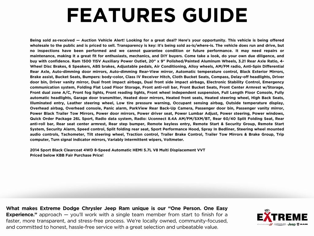 Being sold as-received â" Auction Vehicle Alert! Looking for a great deal? Hereâs your opportunity. This vehicle is being offered wholesale to the public and is priced to sell. Transparency is key: itâs being sold as-is/where-is. The vehicle does run and drive, but no inspections have been performed and we cannot guarantee condition or future performance. It may need repairs or maintenance, making it a great fit for enthusiasts, mechanics, and DIY buyers. Come take a look, do your own due diligence, and buy with confidence. Ram 1500 115V Auxiliary Power Outlet, 20" x 9" Polished/Painted Aluminum Wheels, 3.21 Rear Axle Ratio, 4-Wheel Disc Brakes, 6 Speakers, ABS brakes, Adjustable pedals, Air Conditioning, Alloy wheels, AM/FM radio, Anti-Spin Differential Rear Axle, Auto-dimming door mirrors, Auto-dimming Rear-View mirror, Automatic temperature control, Black Exterior Mirrors, Brake assist, Bucket Seats, Bumpers: body-color, Class IV Receiver Hitch, Cloth Bucket Seats, Compass, Delay-off headlights, Driver door bin, Driver vanity mirror, Dual front impact airbags, Dual front side impact airbags, Electronic Stability Control, Emergency communication system, Folding Flat Load Floor Storage, Front anti-roll bar, Front Bucket Seats, Front Center Armrest w/Storage, Front dual zone A/C, Front fog lights, Front reading lights, Front wheel independent suspension, Full Length Floor Console, Fully automatic headlights, Garage door transmitter, Heated door mirrors, Heated front seats, Heated steering wheel, High Back Seats, Illuminated entry, Leather steering wheel, Low tire pressure warning, Occupant sensing airbag, Outside temperature display, Overhead airbag, Overhead console, Panic alarm, ParkView Rear Back-Up Camera, Passenger door bin, Passenger vanity mirror, Power Black Trailer Tow Mirrors, Power door mirrors, Power driver seat, Power Lumbar Adjust, Power steering, Power windows, Quick Order Package 26L Sport, Radio data system, Radio: Uconnect 8.4A AM/FM/SXM/BT, Rear 60/40 Split Folding Seat, Rear anti-roll bar, Rear seat center armrest, Rear step bumper, Remote keyless entry, Remote Start & Security Group, Remote Start System, Security Alarm, Speed control, Split folding rear seat, Sport Performance Hood, Spray In Bedliner, Steering wheel mounted audio controls, Tachometer, Tilt steering wheel, Traction control, Trailer Brake Control, Trailer Tow Mirrors & Brake Group, Trip computer, Turn signal indicator mirrors, Variably intermittent wipers, Voltmeter.